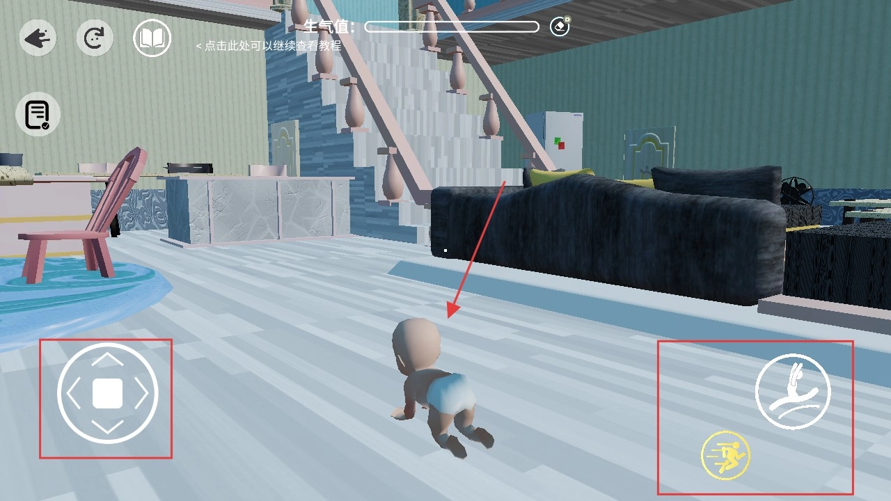 2、用左侧摇杆移动、右侧按键(爬行、奔跑)操控婴儿。