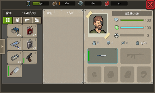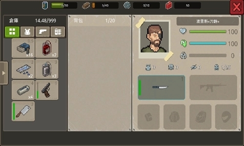 物品管理:点击背包图标打开物品栏,点击物品即可使用(如吃东西、喝水)或装备(如穿衣、换枪)。注意背包空间有限,需合理丢弃无用物品。