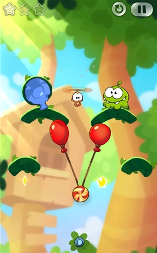 4、点破右边的气球,让糖果在力的作用下荡到左边吃到最后一颗星星。