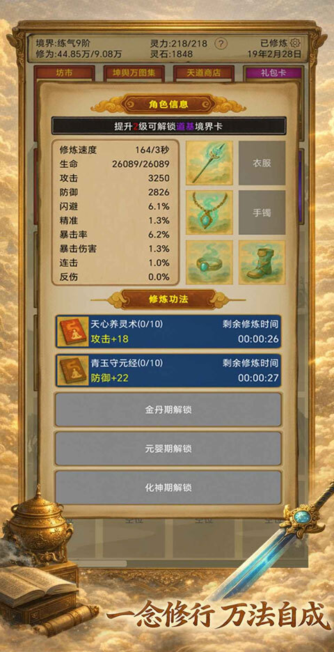 1. 日常通过吐纳和炼丹获得修为与资源。