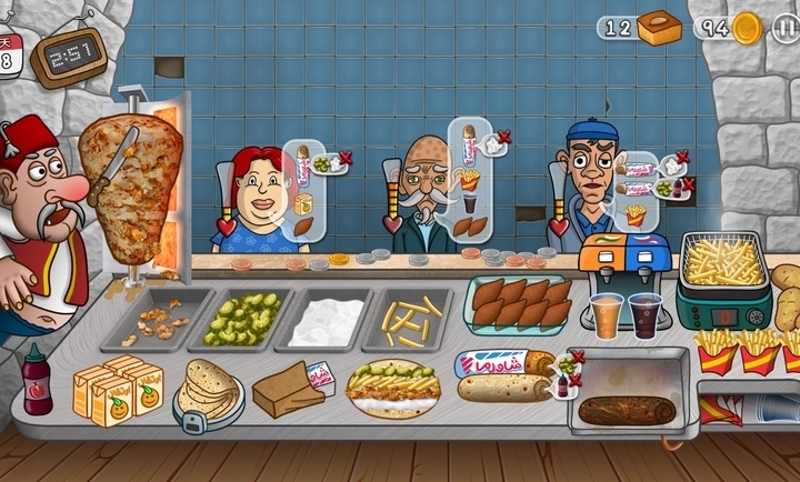 《沙威玛卷饼官方版》的玩法融合了模拟经营、时间管理和烹饪技巧,核心循环是“接单→制作→出餐→升级”: