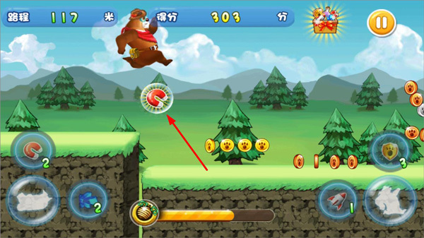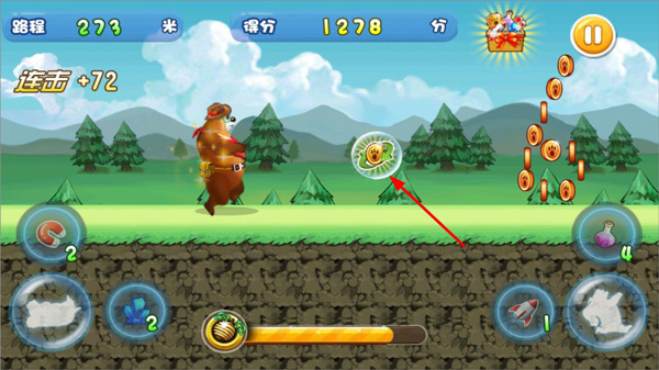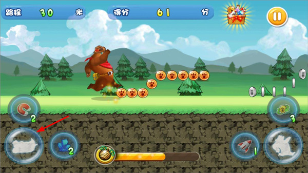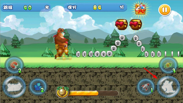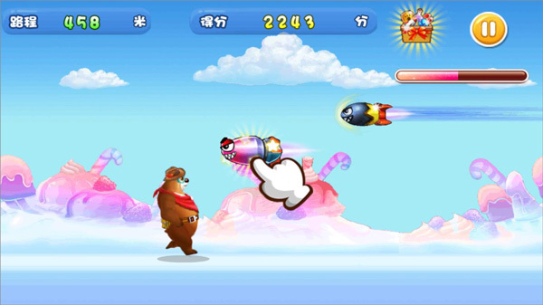 6、当《夺宝熊兵》屏幕下方的进度条填满时,会进入奖励模式。在奖励模式中点击飞弹,可阻止它击中熊大,击中的飞弹数量越多,获得的分数就越高。