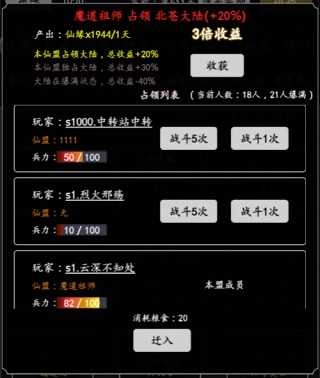 当一个仙盟将同一大陆上非本盟的所有道友都驱逐出该大陆后,就能获得占领特权,届时本仙盟的全体道友收益都会提升20%。