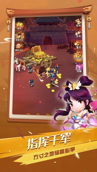 五大兵种一键合成,佛系挂机收获超高资源收益,自动推图扫荡更轻松,多种休闲护肝设计助你畅游三国!