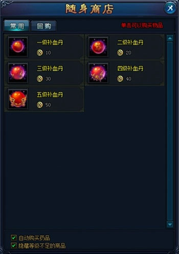 点击背包界面里的【商店】按钮,就能进入如上图呈现的个人随身商店,玩家可以在这个商店里购买常用的道具。