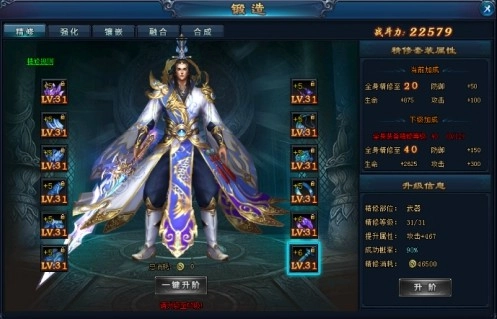如上图所示,消耗铜钱,可以给装备进行精修,静修成功则相应属性提升。
