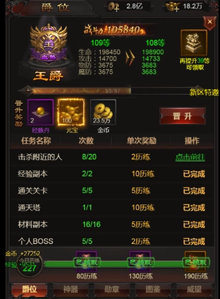 爵位能够通过晋升和提升官位来获取奖励与增益。晋升爵位需要积累“历练值”,而历练值可以通过完成每日任务得到,所以要积极完成日常任务。当历练值积攒到一定数量时,就能获得晋升的机会。晋升不仅可以提升多种属性,还能得到元宝、金币和经脉丹等材料奖励。