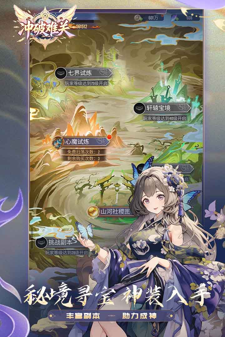 挑战心魔试炼:获取神将升级材料,每关还能得“仙豆”抽神兵(快速提升属性);