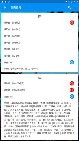 输入内容后,点击“搜索”按钮。应用会显示与输入内容相关的潮州话发音、释义和例句。点击发音图标,可以听到标准的潮州话发音示范。