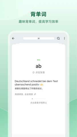 打开德语助手免费版,点击首页的“单词学习”或“背单词”按钮,进入单词学习页面。