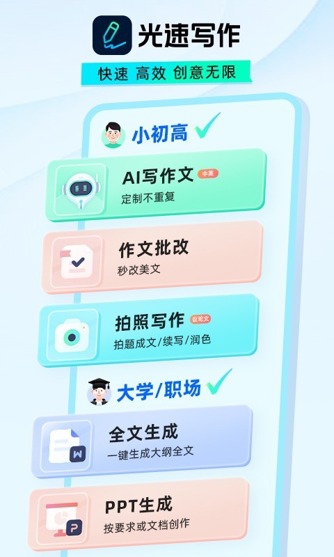 1、光速写作可以帮助您快速生成高质量的文章,有效提高您的写作效率。