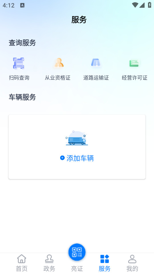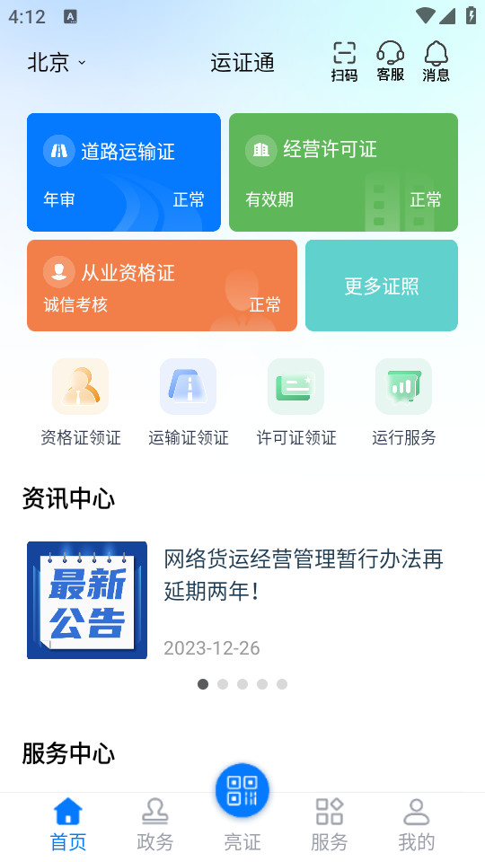 在首页,点击页面正下方的“亮证”按钮,即可快速展示证照二维码,同时还能够切换不同的证照类型。