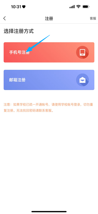 1、在优学院的登录页面,点击注册,进入注册方式选择页面。