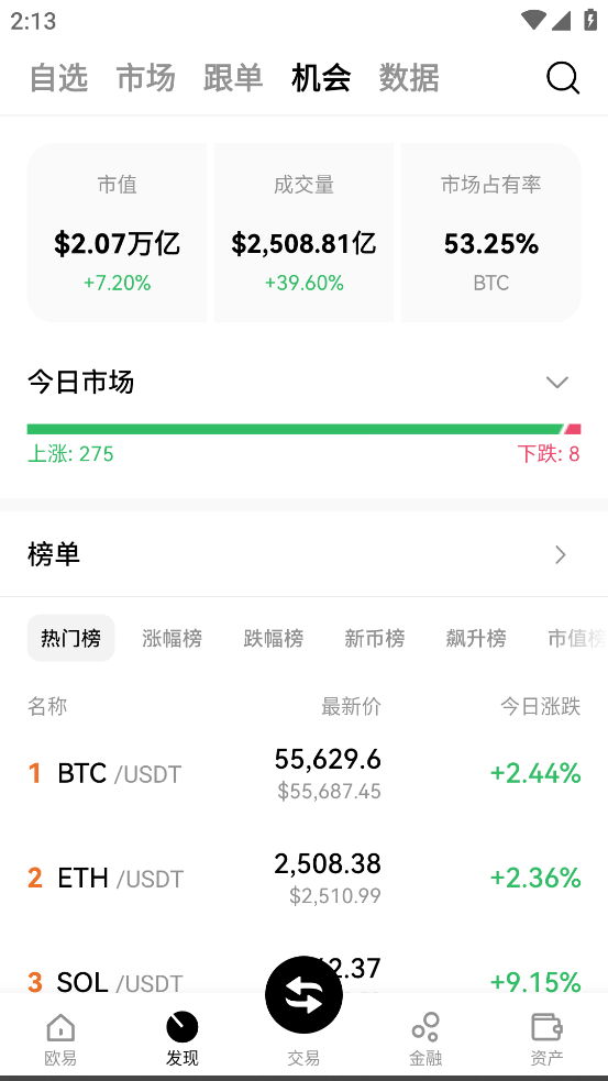 市场数据:关注交易对的最新价格、24小时涨跌幅、交易量等数据,为交易决策提供参考。