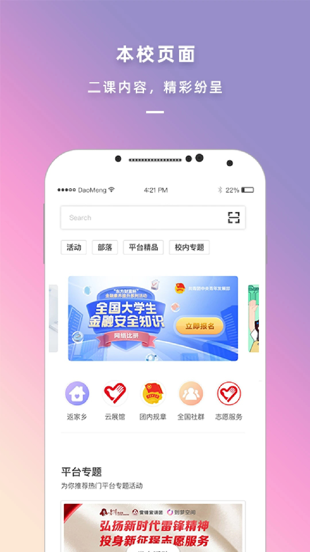 到梦空间是一款多终端免费校园应用,专为大学生设计,旨在通过信息化手段优化第二课堂管理。系统自2016年上线以来,已迭代至最新版本,支持iOS、Android及网页端访问。其核心功能包括活动全流程管理(发布、报名、签到、评价)、社团在线运营、日程规划、学分查询及与教务系统对接的课表同步功能,助力学生高效规划大学生活。