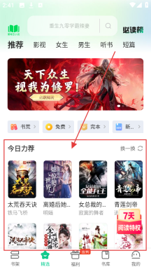 1、启动软件后,进入精选页面,在【今日力荐】板块中陈列着众多精彩小说,您可以挑选一本感兴趣的,开启您的阅读之旅。