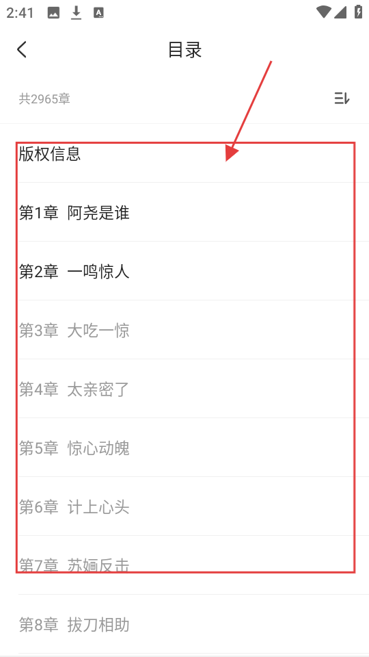 3、在目录区域,各章节标题清晰可见,像【第1章-阿尧是谁】【第2章-一鸣惊人】这类标题都能直观看到,你可以选择自己想看的章节,点击标题就能进入对应的内容页面。