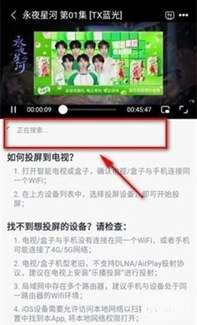 3、播放窗口下方会显示“正在搜索”,等搜索到电视设备后,点击连接就能完成投屏。