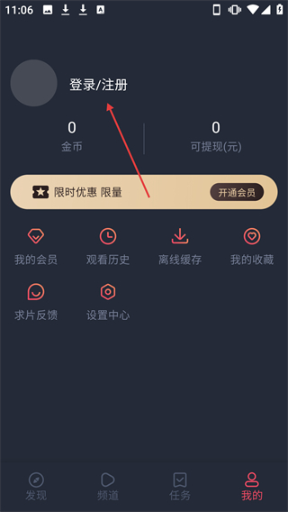 1、在频道页面点击底部的【我的】选项,即可进入个人中心页面。
