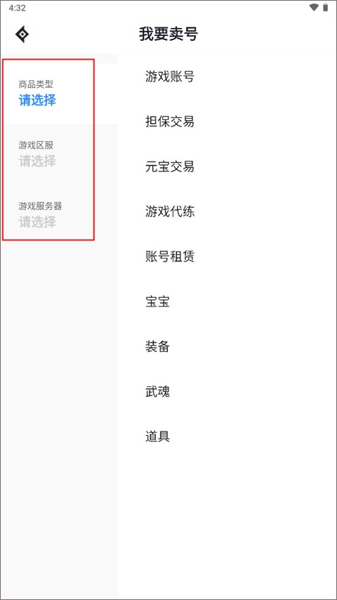 3、接下来就是选择商品类型、游戏区服、游戏服务器等信息。
