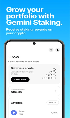 Gemini Earn:将闲置的加密货币存入即可获得浮动利息,支持多种币种(如BTC、ETH、稳定币等),年化收益率根据市场动态调整。