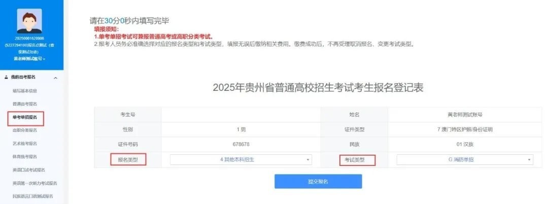 ②单考单招报名:报考消防单招、职教师资考试、残障生单独考试、运动训练、武术与民族传统体育等单独招生类别的考生,需进入【我的高考报名】->【单考单招报名】菜单,完成相关信息的填报。