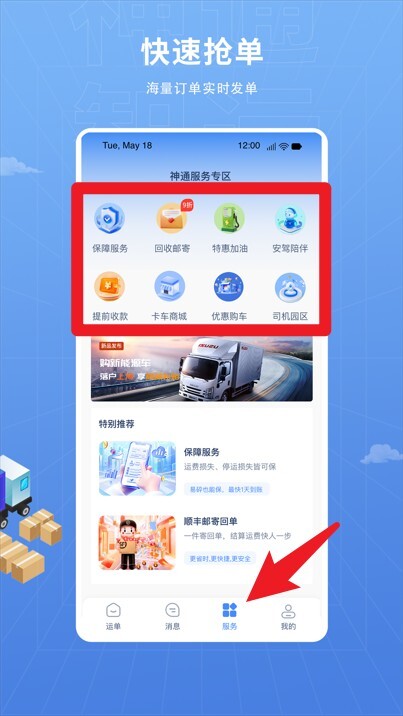 3、点击底部的“服务”按钮进入服务专区,这里提供保险、油卡、回收货等多项实用功能可供选择。