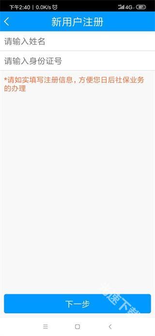 3、点击“新用户注册”输入姓名和身份证号然后点击下一步