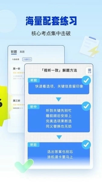 “听力磨耳朵”与跟读训练:提供真题听力材料的逐句精听、倍速播放、跟读评分功能,帮助用户提升听力敏感度和口语发音,针对性解决“看得懂听不懂”的问题。