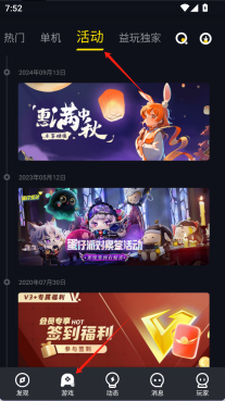 3、游戏预约:打开后选择下方【游戏】分类选项卡,点击【活动】进入【游戏预约专场】;