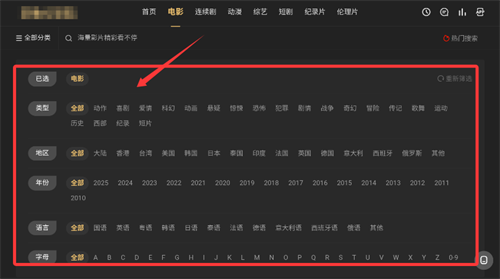 3、选择电影类别后,支持按题材、地区及年份等多重条件筛选片目。