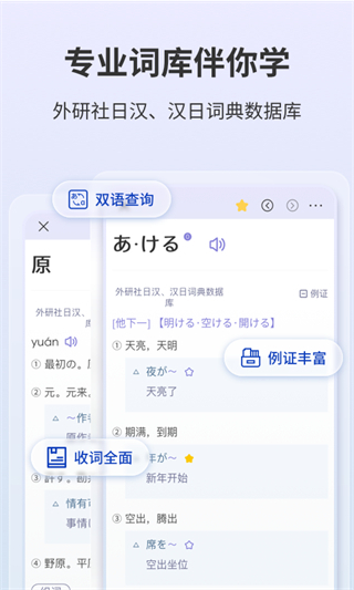 依托外研社独家的日汉汉日词典数据库,我们为用户提供精准且全面的单词释义,搭配贴合实际应用场景的例句,为查询词汇、理解语义提供权威保障,帮助学习者筑牢词汇根基,增强语言运用的精准度。