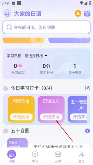 1、在外研社大家的日语首页,找到今日学习打卡中的口语达人板块,点击开始学习。