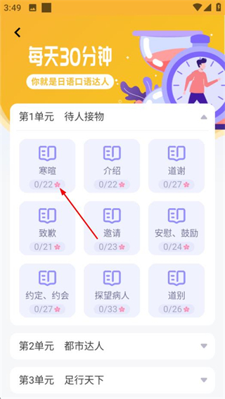 2、进入口语达人学习页面,可选择第1单元待人接物下的寒暄等内容进行学习。