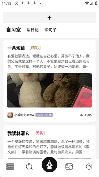 2.【自由练笔写作】用户能够自由上传自己的作品,与他人展开交流互动,同时平台还设有自习室,方便大家进行打卡学习。