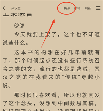 2、确定要阅读后,在小说阅读页面点击屏幕中央,调出功能列表,然后点击右上角的“换源”按钮,就能切换小说的书源地址了。
