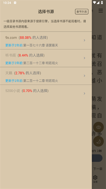 3、如此一来,用户只需在选择来源的页面中,找到更新速度快的书源网站,点击即可完成换源,从而获得良好的阅读体验。
