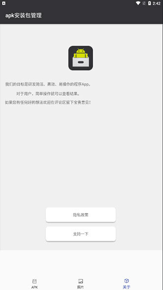 在本站安装并运行软件后,会看到APK、图片、关于三个板块。进入APK板块,就能查看手机里所有的安装包,还可以自由查询安装路径,以及进行安装或删除操作。