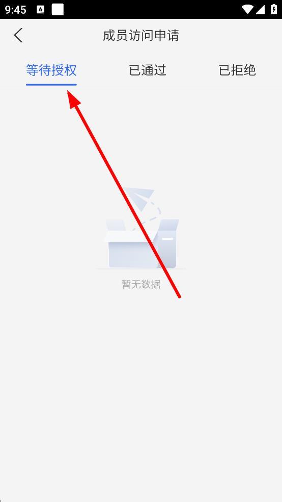 2、进入成员访问申请页面,可查看等待授权,已通过,已拒绝的分类下的申请,进行授权操作。