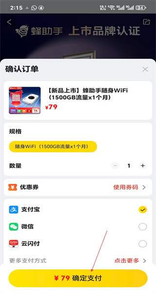4、进入确认订单页面后,先选择好支付方式,接着找到“确定支付”按钮,点击此按钮即可完成商品购买流程。
