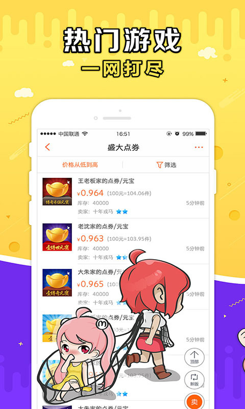 品类齐全:覆盖盛趣游戏全区全服,提供账号、装备、金币、点券等一站式购物服务。