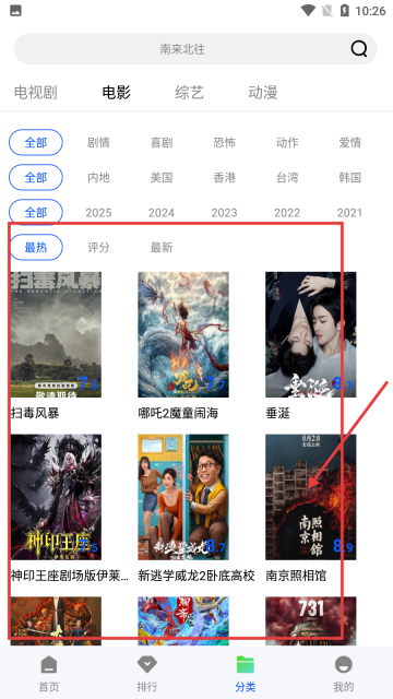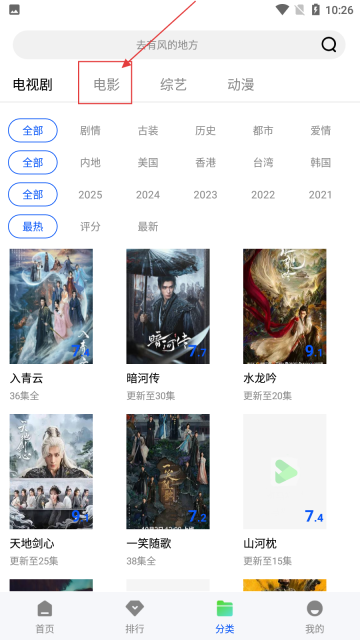 2、进入分类界面后,点击【电影】分类标签,可查看电影相关内容。