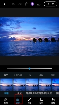 6、点击第二个图标后,即可对图片执行锐化、降噪、模糊、晕影、HSL、色调分割等操作,也能手动调整曝光、对比度等参数;左右滑动箭头指向的第二个选项框,还可调节更多参数。