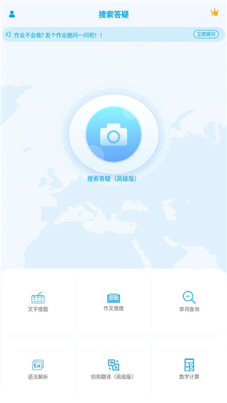 1、在本站安装并打开拍照搜题应用,进入软件首页后,用户可以使用文字搜题、作文搜索、单词查询等多种实用功能。