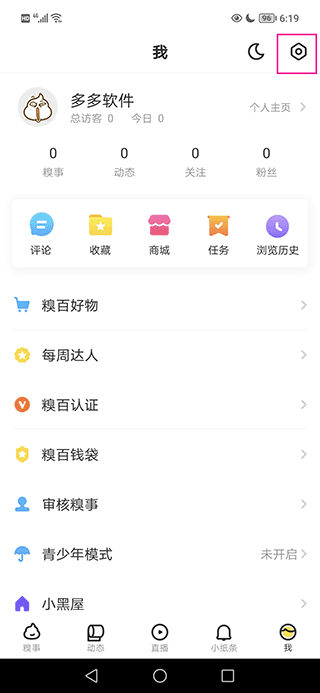 1、打开软件,找到并点击右下角的“我”按键,然后在这个界面找到并点击右上角的齿轮;