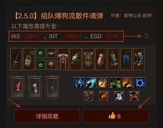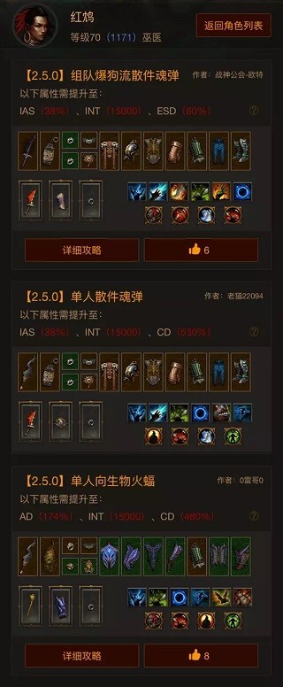 进入巫医角色界面后,你会发现提升神器已备好当前最热门的几套BD指南,像大隐藏的组队爆狗魂弹、单人散件魂弹、生物火蝠等。点击配装指南里的装备或技能图标,就能查看装备详情以及技能/符文的描述,点击“详细攻略”按钮还能阅读凯恩高玩撰写的BD详情和打法教学!