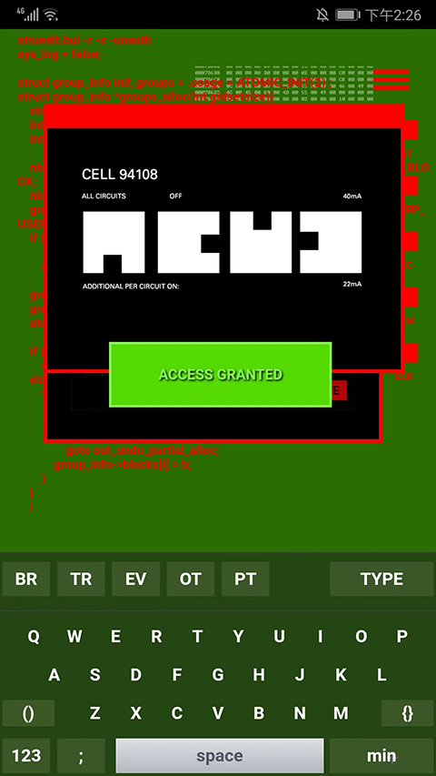2、启动软件后,随意敲击键盘上的字母,软件界面就会显示出预先准备好的条理清晰的代码;当敲击键盘的操作进行得差不多时,按下enter键或alt键,就能弹出显示“拒绝访问”或“允许访问”的英文窗口,以此表示操作结束。