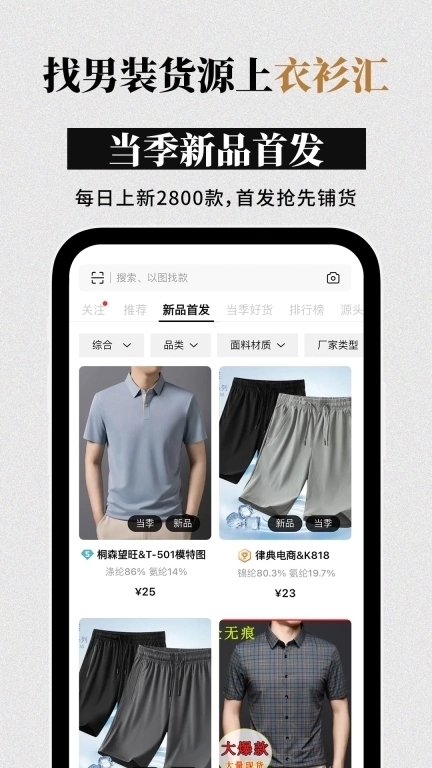 衣衫汇男装网批是一个专门面向男装批发商、网络分销商和实体门店的高效货源平台。借助浙江濮院服装产业带的优势,平台整合了1800多家男装制造商的货源信息。用户通过这个平台能轻松获取大量男装商品资源,还可享受一键铺货、代发服务和极速发货等便捷功能,大幅降低了创业的门槛,助力用户实现无忧经营。