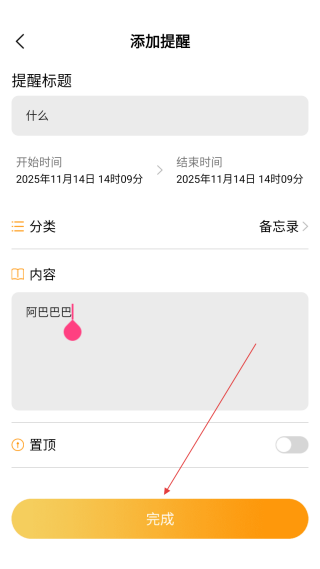 4、填写完成后,点击【完成】,即可完成添加提醒操作。