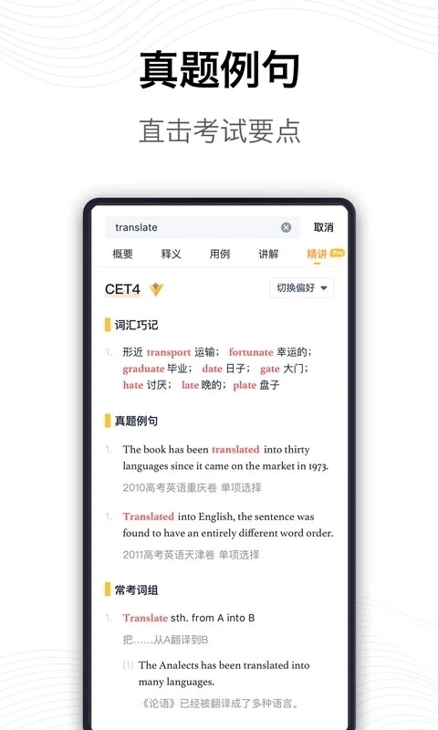 5、依据考纲对每个单词的应用进行详尽解析,涵盖真题讲解等内容;独家研发的智能饼图释义功能,也为用户呈现了更直观的使用参考依据。